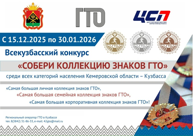 Подвели итоги регионального конкурса «Собери коллекцию знаков ГТО»! В рамках популяризации комплекса «Готов к труду и обороне» и пропаганды здорового образа жизни, с 15 декабря 2025 года по 30 января 2026 года прошел региональный конкурс «Собери коллекцию знаков ГТО», среди всех категорий Кемеровской области-Кузбасса. Этот уникальный проект предназначен для всех категорий населения области — от детей и молодежи до взрослых и семейных команд. По результатам конкурса, комиссия определила победителей и призёров среди 300 участников в трёх номинациях: «Самая большая личная коллекция знаков ГТО»: 1 место-Снегирёв Денис Дмитриевич (Кемеровский городской округ). 2 место-Земченков Михаил Андреевич (Прокопьевский городской округ). 3 место-Никитчук Степан Васильевич (Анжеро-Судженский городской округ). «Самая большая семейная коллекция знаков ГТО»: 1 место- Семья Никитины (Кемеровский городской округ). 2 место- Семья Ажичаковы (Яйский муниципальный округ). 3 место- Семья Бондаревы (Кемеровский муниципальный округ). «Самая большая корпоративная коллекция знаков ГТО»: 1 место-Муниципальное бюджетное учреждение дополнительного образования «Детский оздоровительно-образовательный (профильный) центр» (Кемеровский муниципальный округ). 2 место-Муниципальное автономное дошкольное образовательное учреждение «Детский сад общеразвивающего вида с приоритетным осуществлением деятельности по художественно-эстетическому направлению развития воспитанников № 12 «Счастливый островок» (Мариинский муниципальный округ). 3 место-Муниципальное автономное дошкольное образовательное учреждение «Детский сад №10» Аленький цветочек» (Прокопьевский городской округ). Поздравляем победителей и призеров!