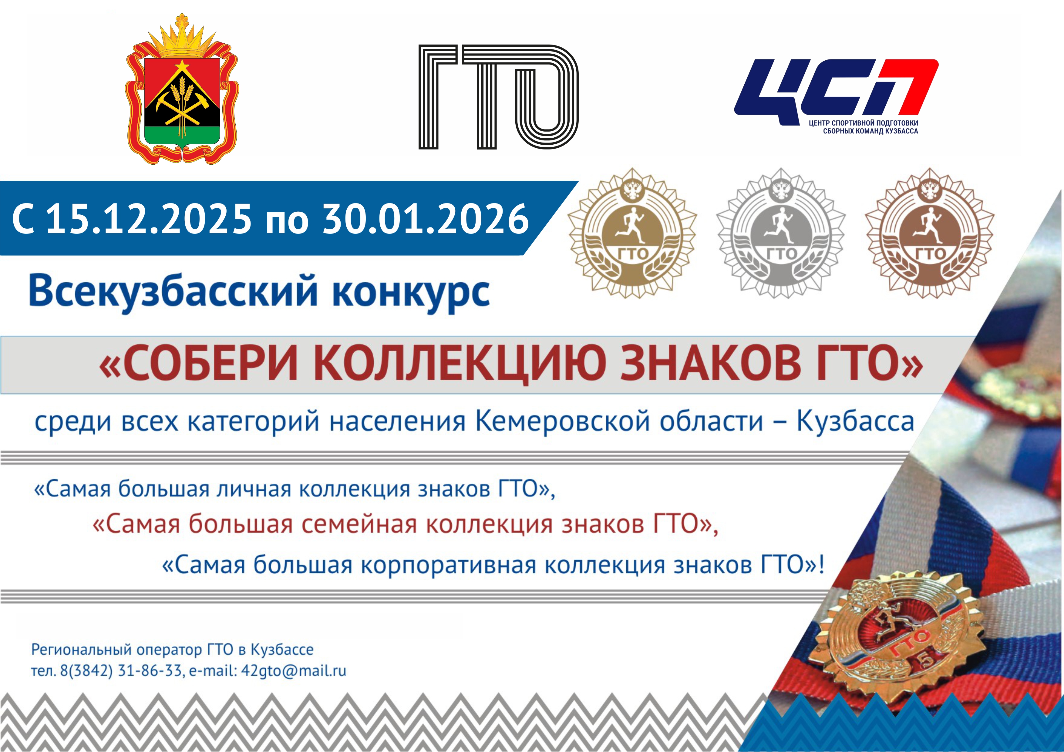 15 декабря 2025 года по 30 января 2026 года в Кемеровской области - Кузбассе проходит региональный конкурс ВФСК ГТО «Собери коллекцию знаков ГТО». Конкурс направлен на вовлечение всех слоев населения Кузбасса в систематические занятия физической культурой и спортом, укрепление семейных ценностей, традиций совместного участия в физкультурно-оздоровительных мероприятиях детей и их законных представителей, распространение практики организации корпоративного досуга и современных форм управления персоналом средствами физической культуры. Конкурс проводится по трем номинациям: «Самая большая личная коллекция знаков ГТО», «Самая большая семейная коллекция знаков ГТО», «Самая большая корпоративная коллекция знаков ГТО». Прием заявок продлится до 25 января 2026 года включительно. Победители и призеры Конкурса будут награждены дипломами Министерства физической культуры и спорта Кузбасса и кубками.